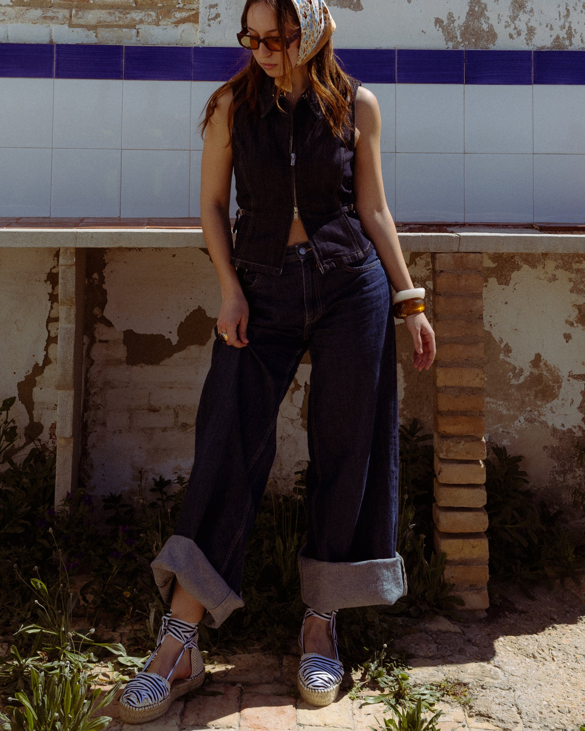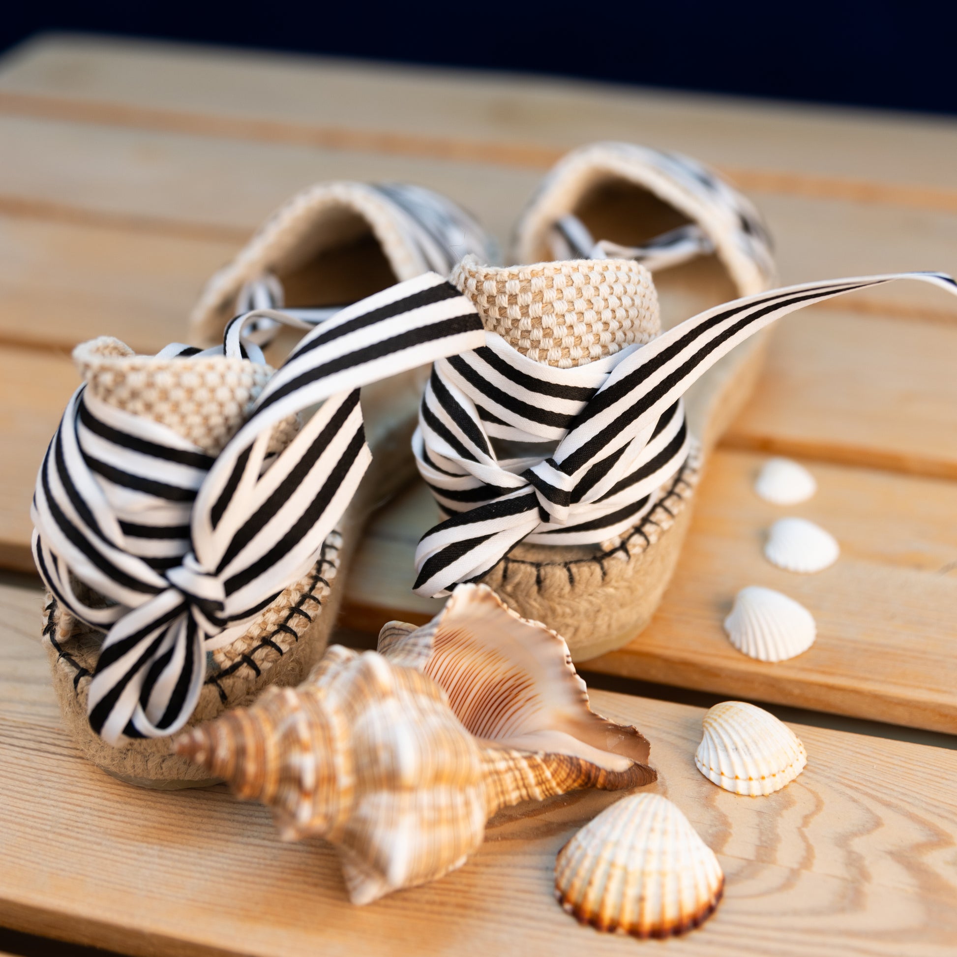 Alpargata tejida con hilo de algodón pulido en tono crudo con cintas anchas marineras y suela doble.