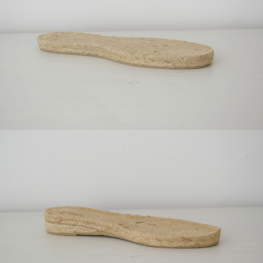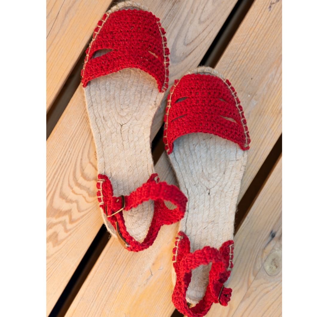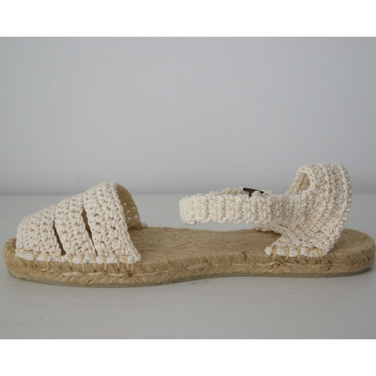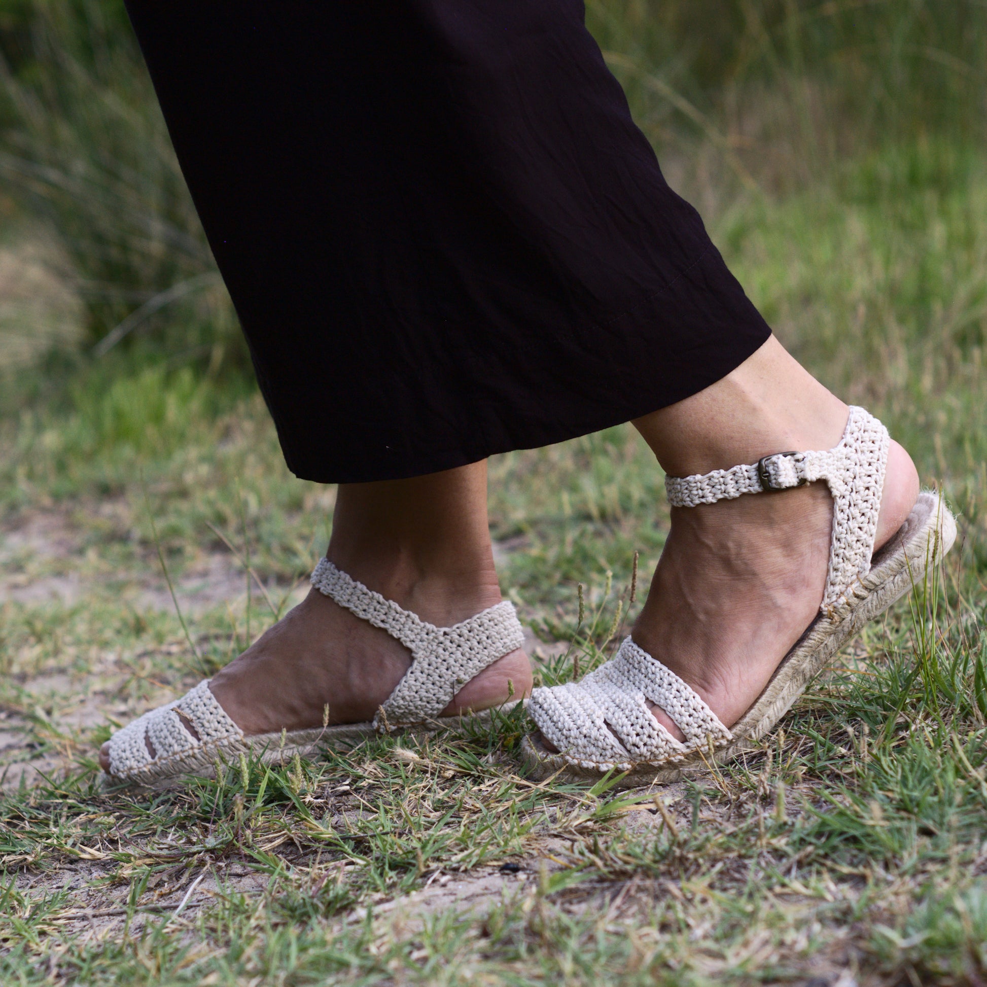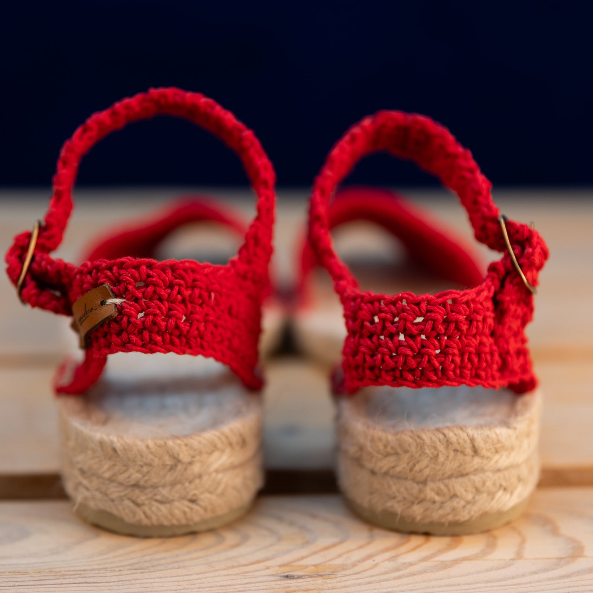 Alpargata tejida con algodón. Suela de yute en dos alturas y atada con hebilla en el tobillo.