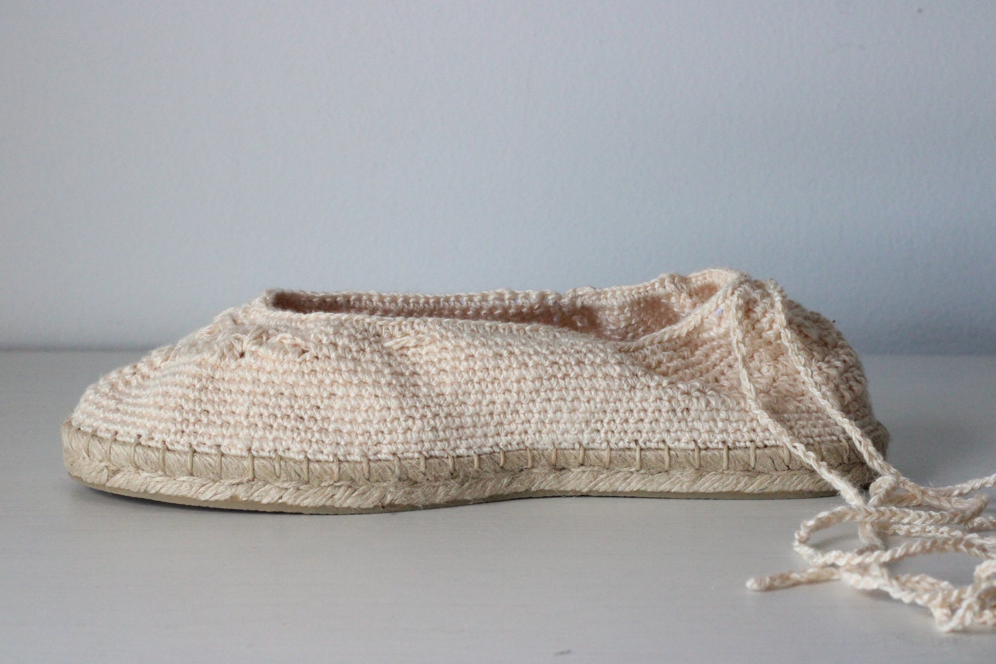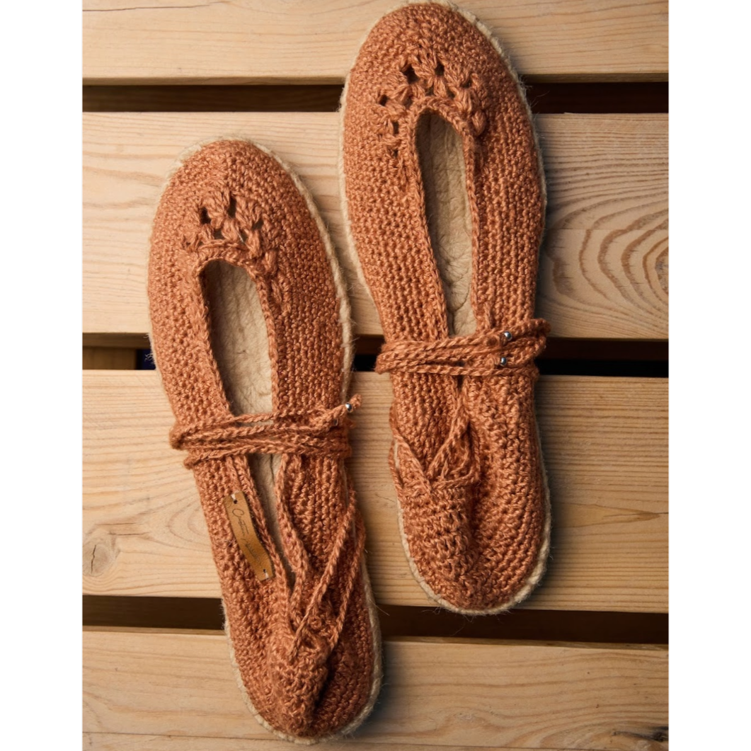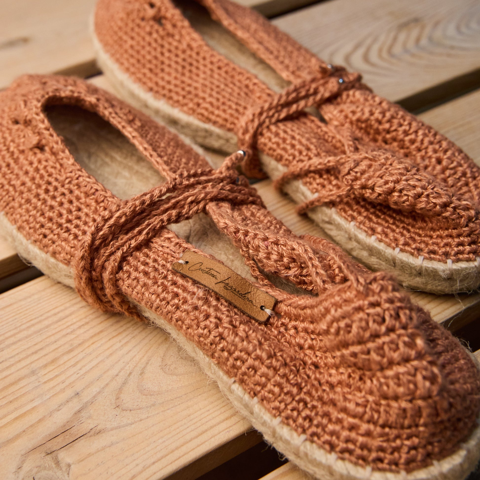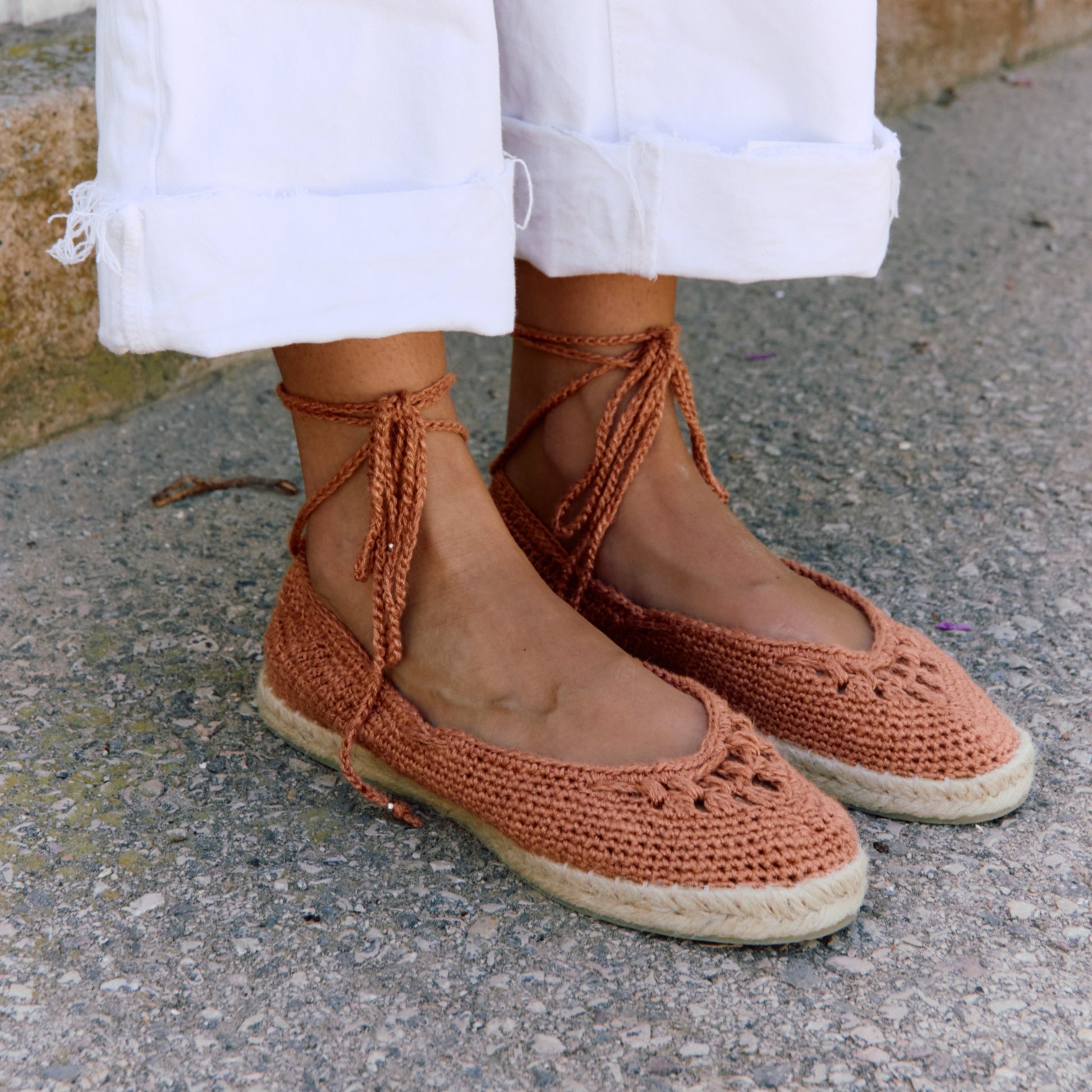 Bailarina tejida con hilo de lino, atada a la pierna. Suela plana de yute. Comprar alpargatas valencianas.