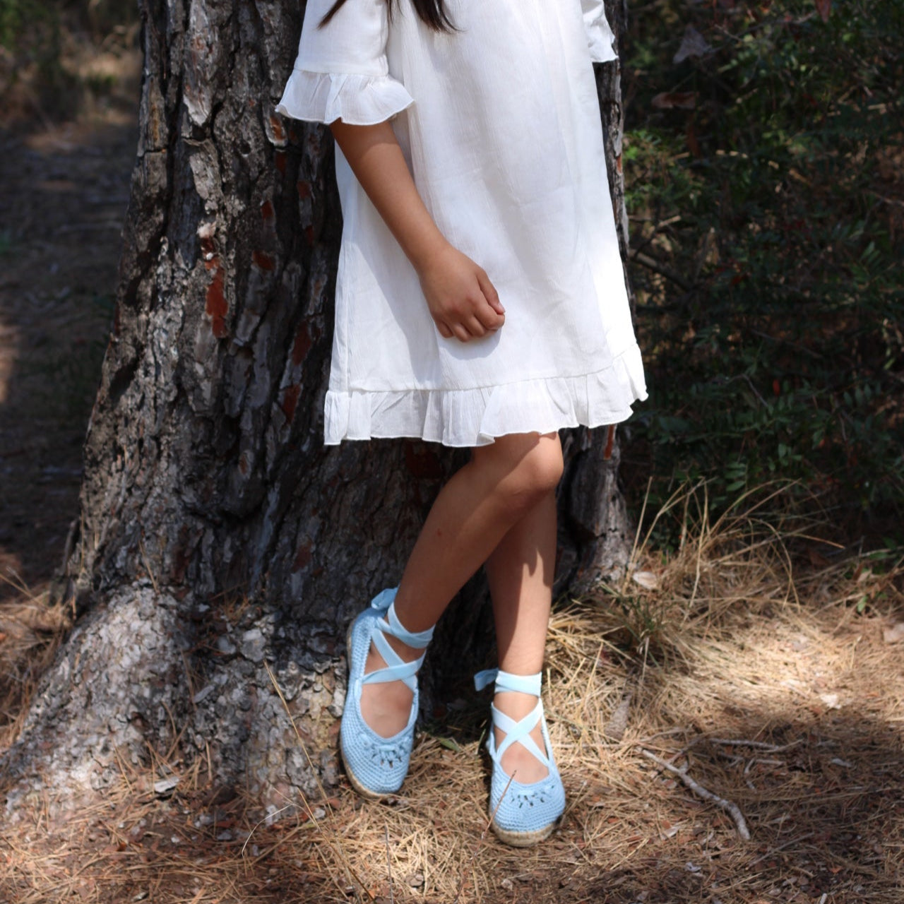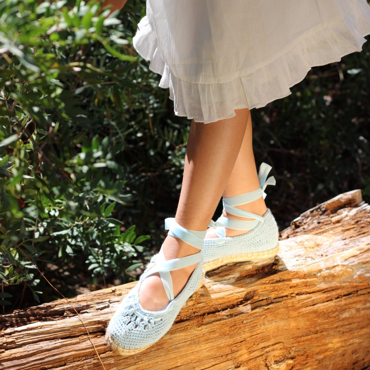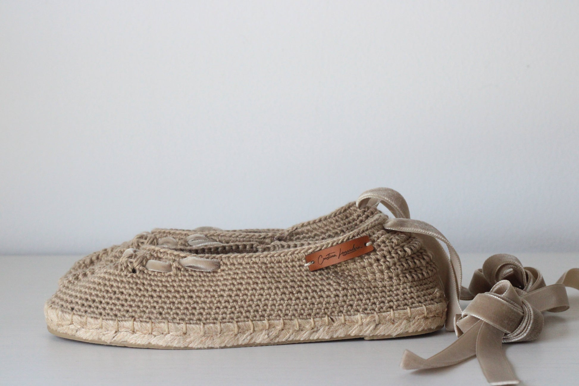 Bailarina tejida con hilo de bambú y atada a la pierna con cinta de algodón. Suela plana de yute.