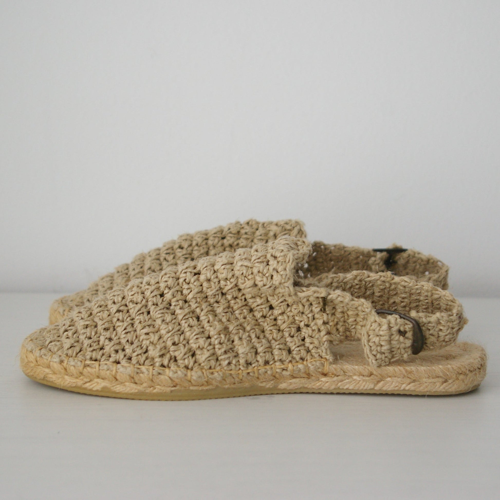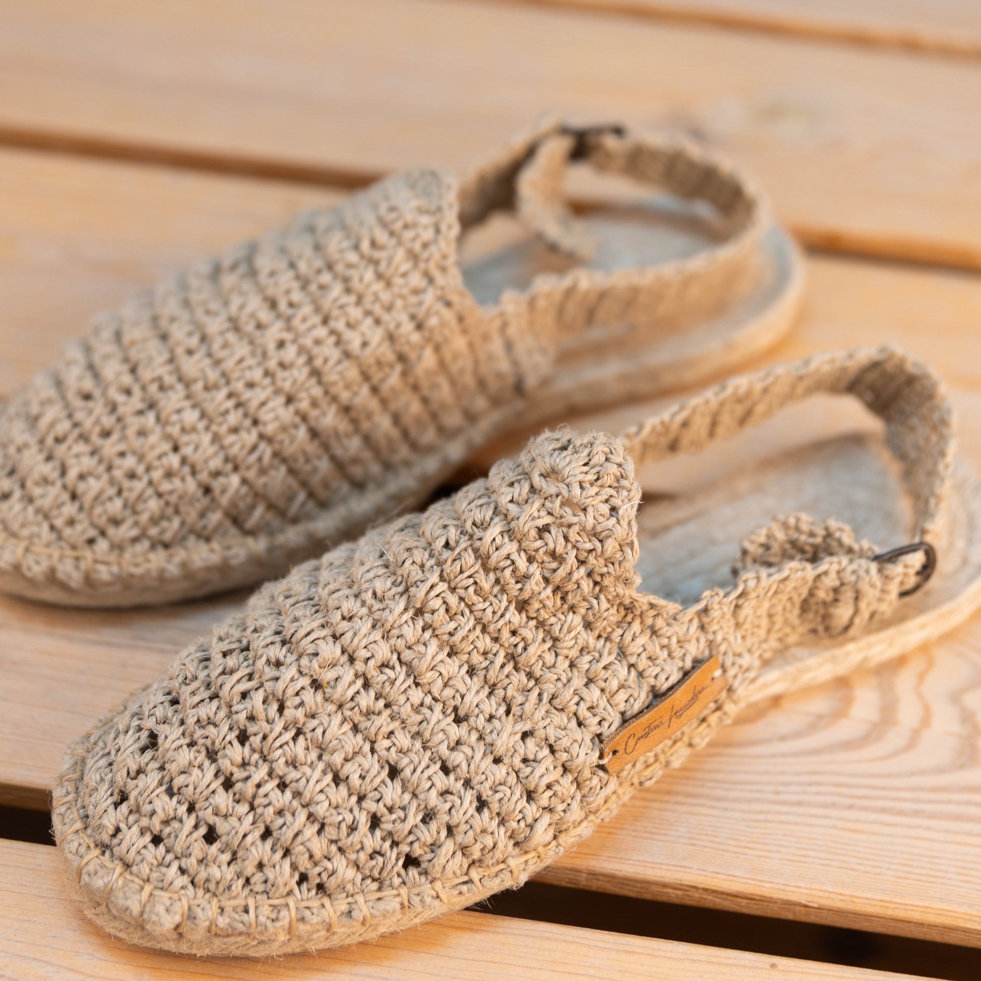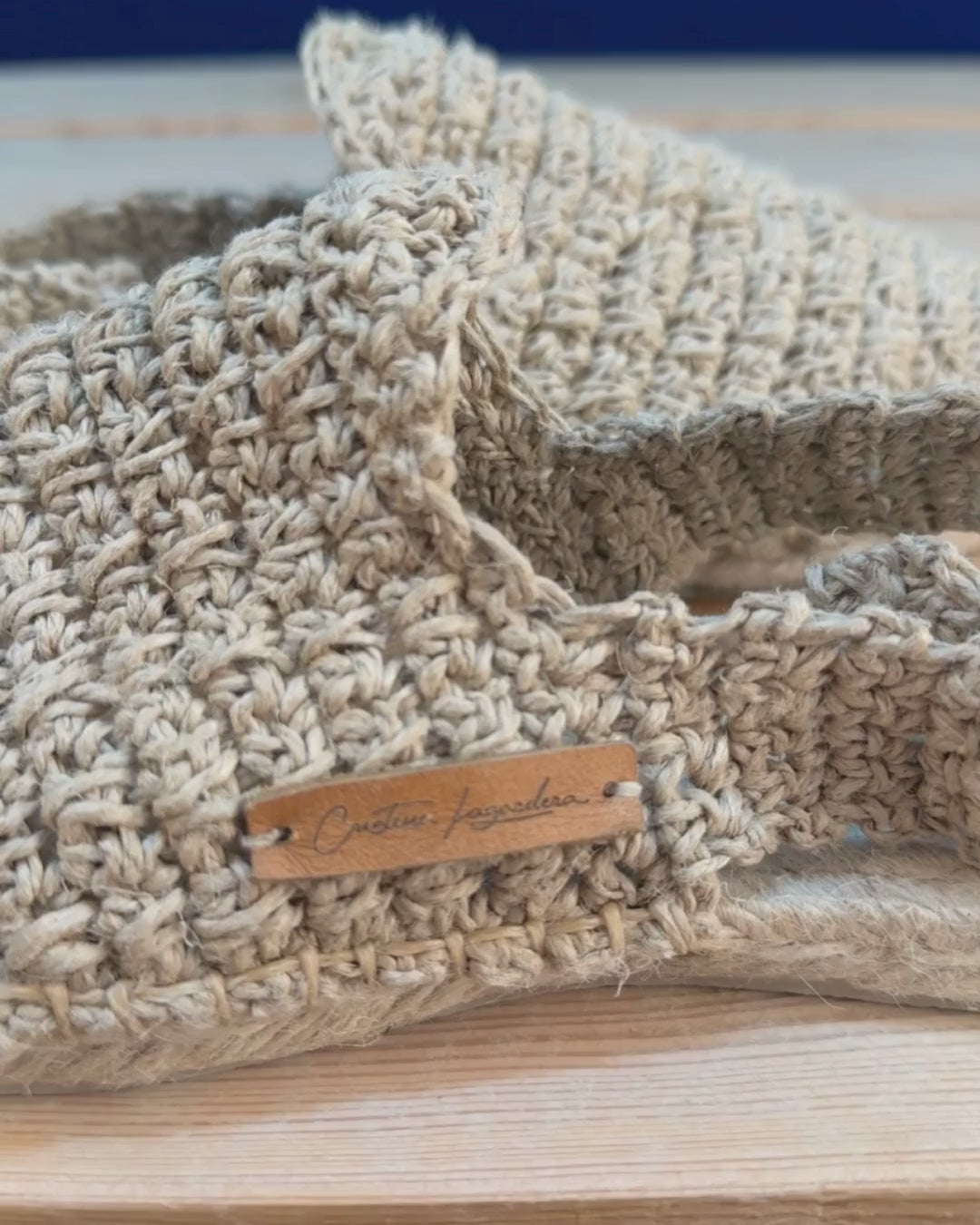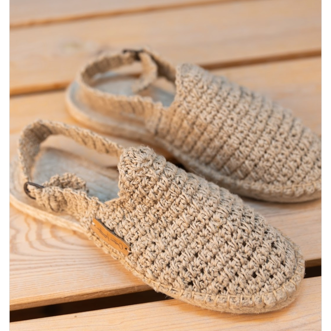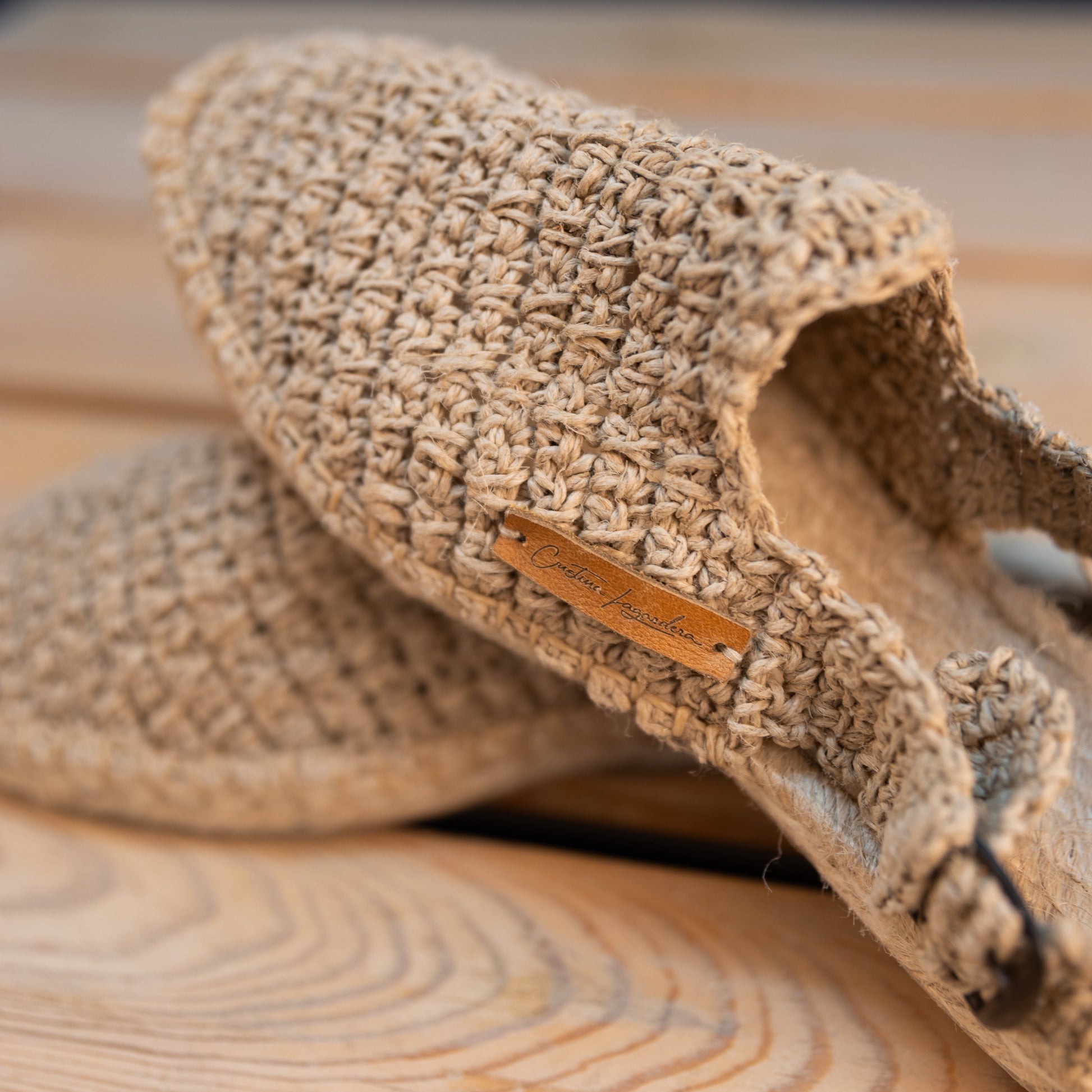 Alpargata tipo zueco tejida con cáñamo y cierre trasero de hebilla. Suela de yute con posibilidad de cuña de 3cm.