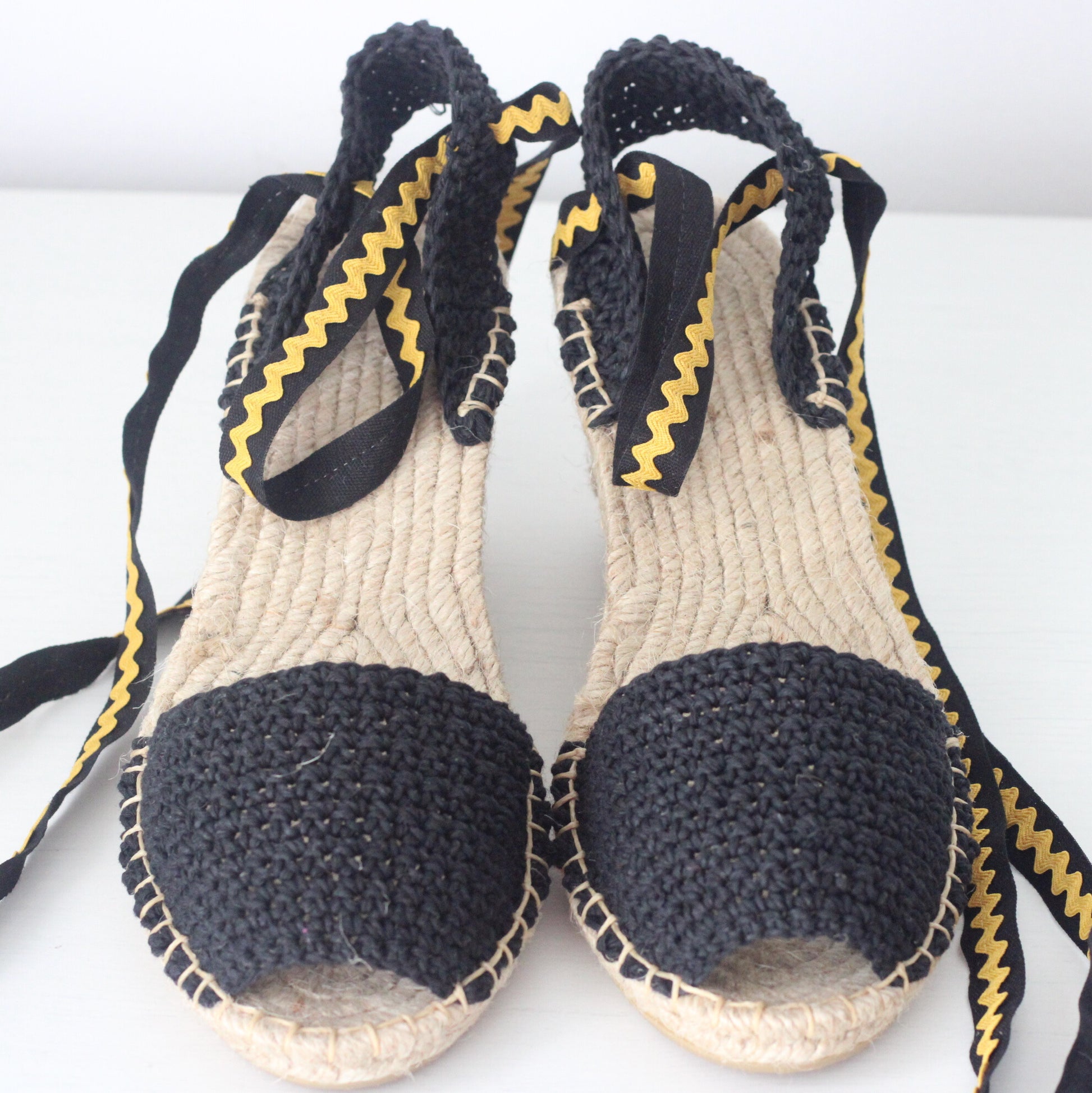 Alpargata con cuña de 9cm tejida con algodón , con puntera abierta y cintas decoradas que se anudan en la pierna.
