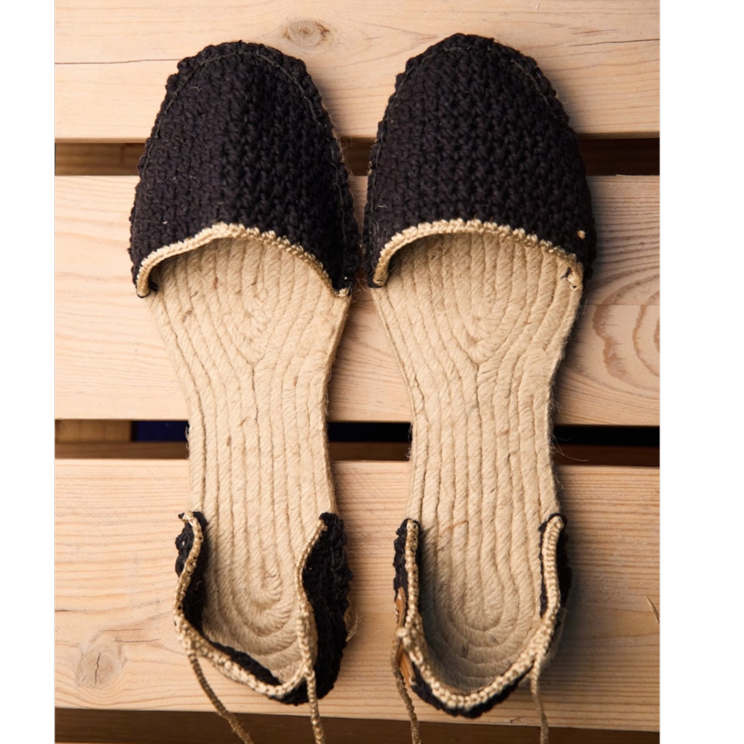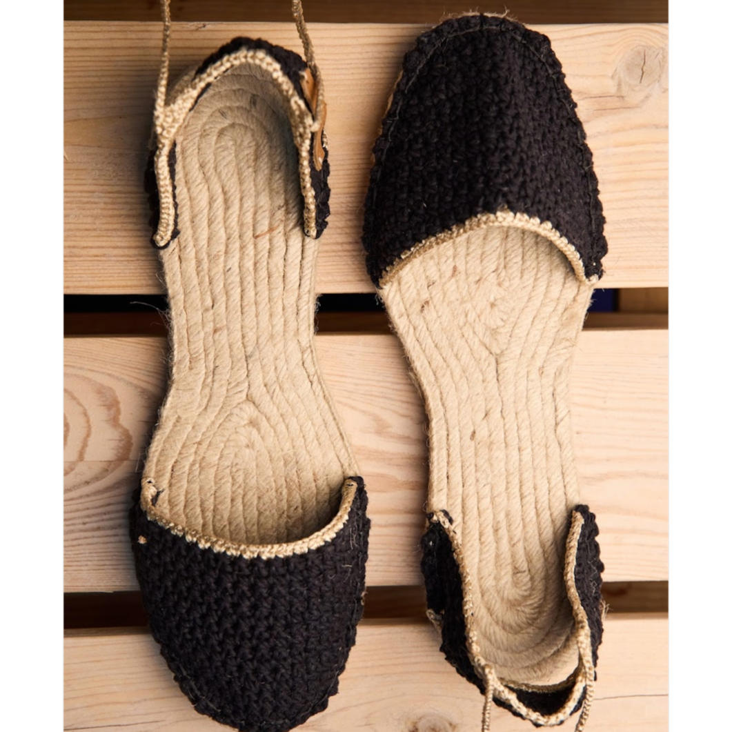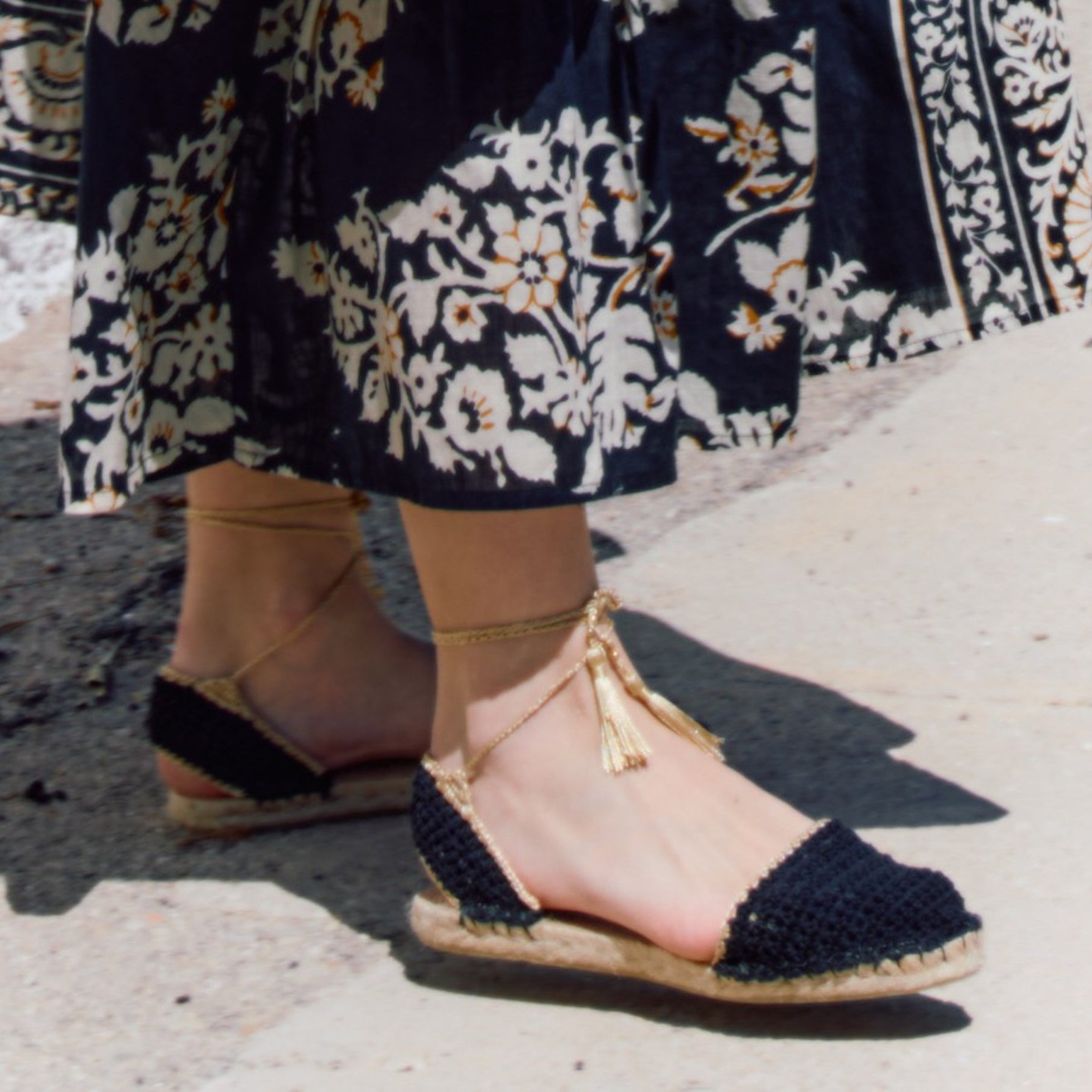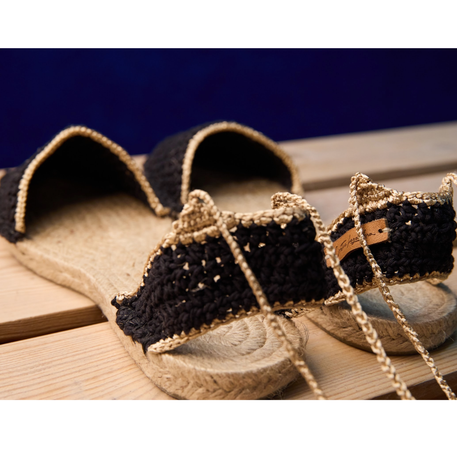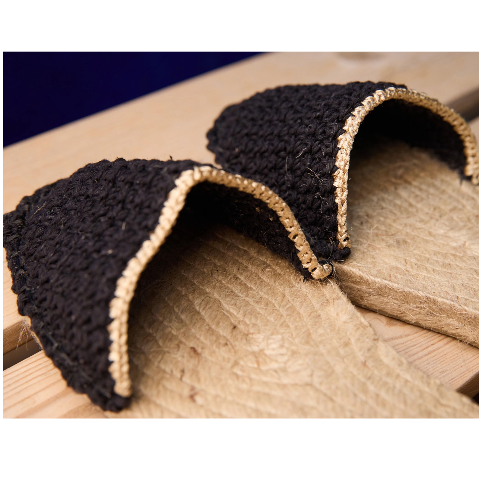 Alpargata tejida en 100% algodón en negro y ribeteada en oro con suela de yute plana